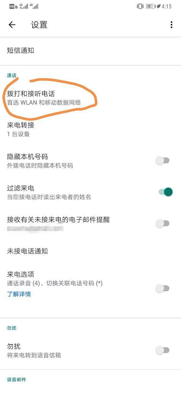 2. 打开Google Voice App的设置,设置Google Voice App的“拨打和接听电话”选项为“首选WLAN和移动网络数据”